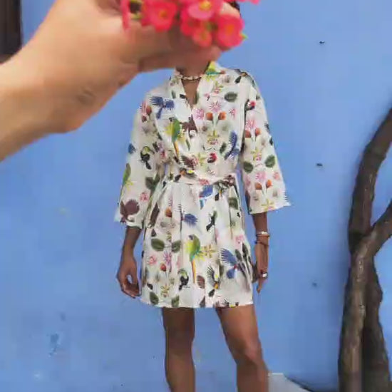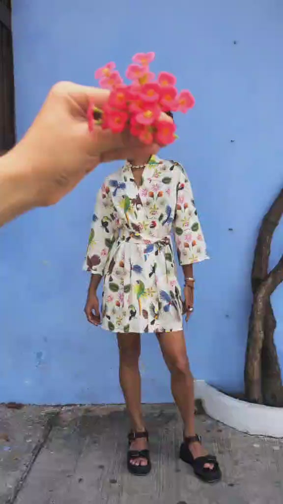 Este kimono está diseñado para que lo puedas usar de múltiples formas. Puedes llevarlo abierto, sin la correa, o cerrarla como un vestido ajustándola con las tiras internas, haciendo un nudo y luego añadiendo la correa para definir la silueta.