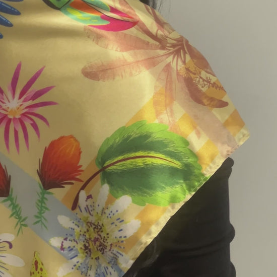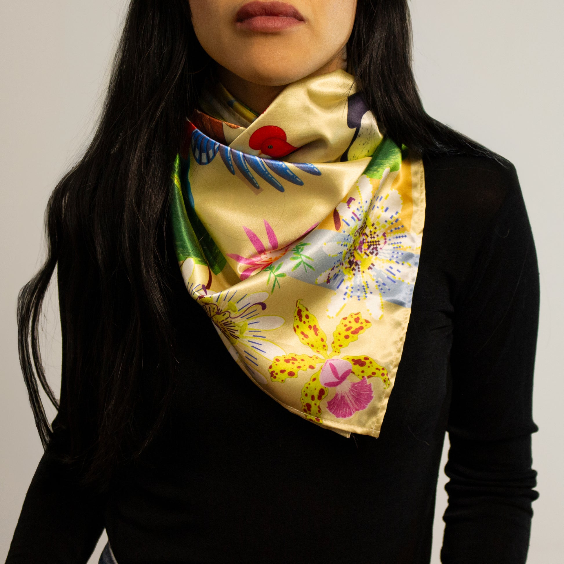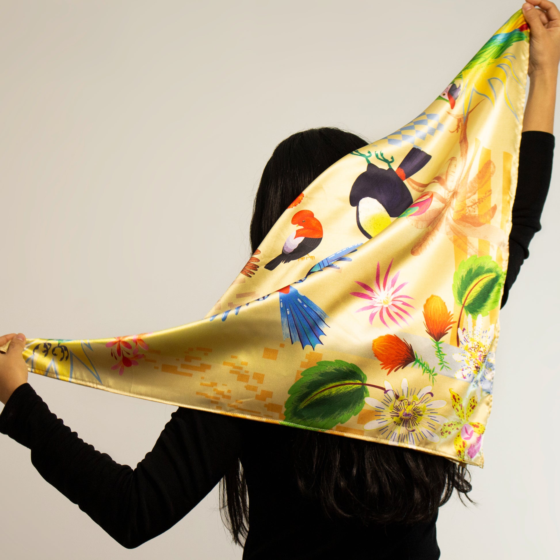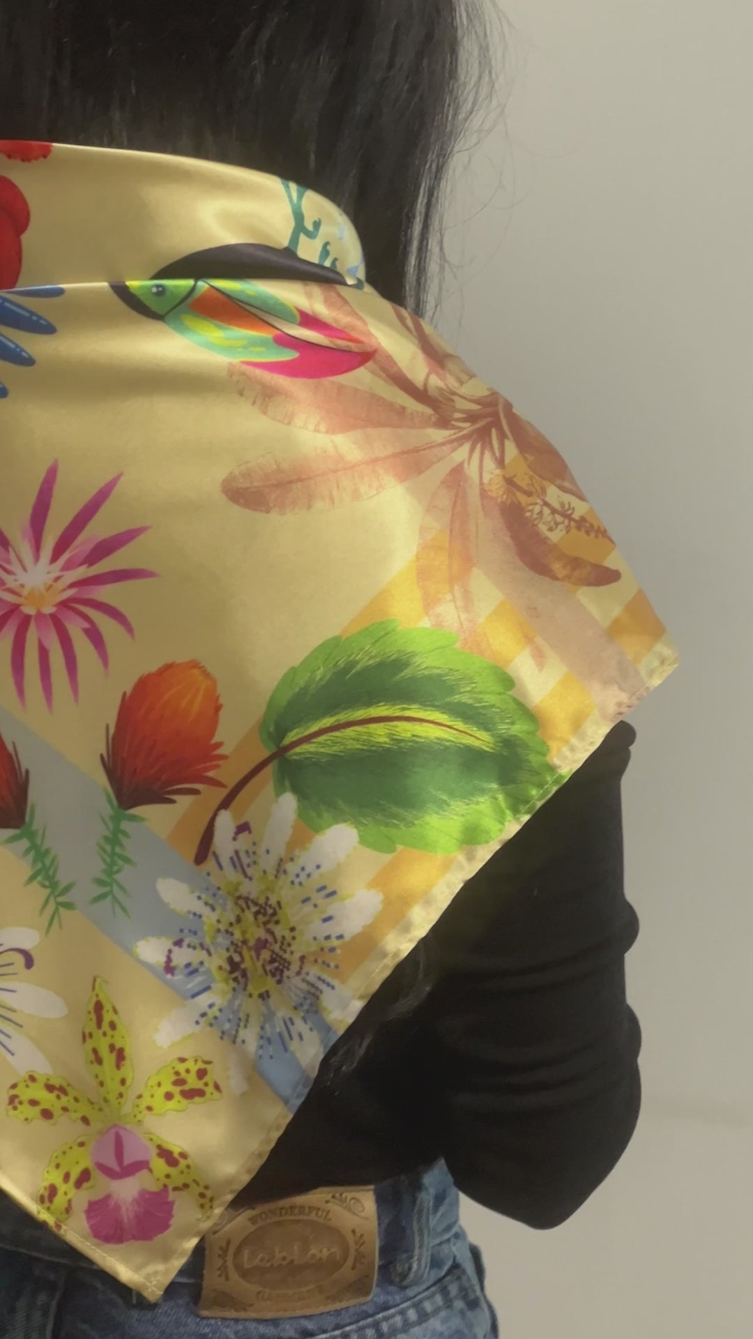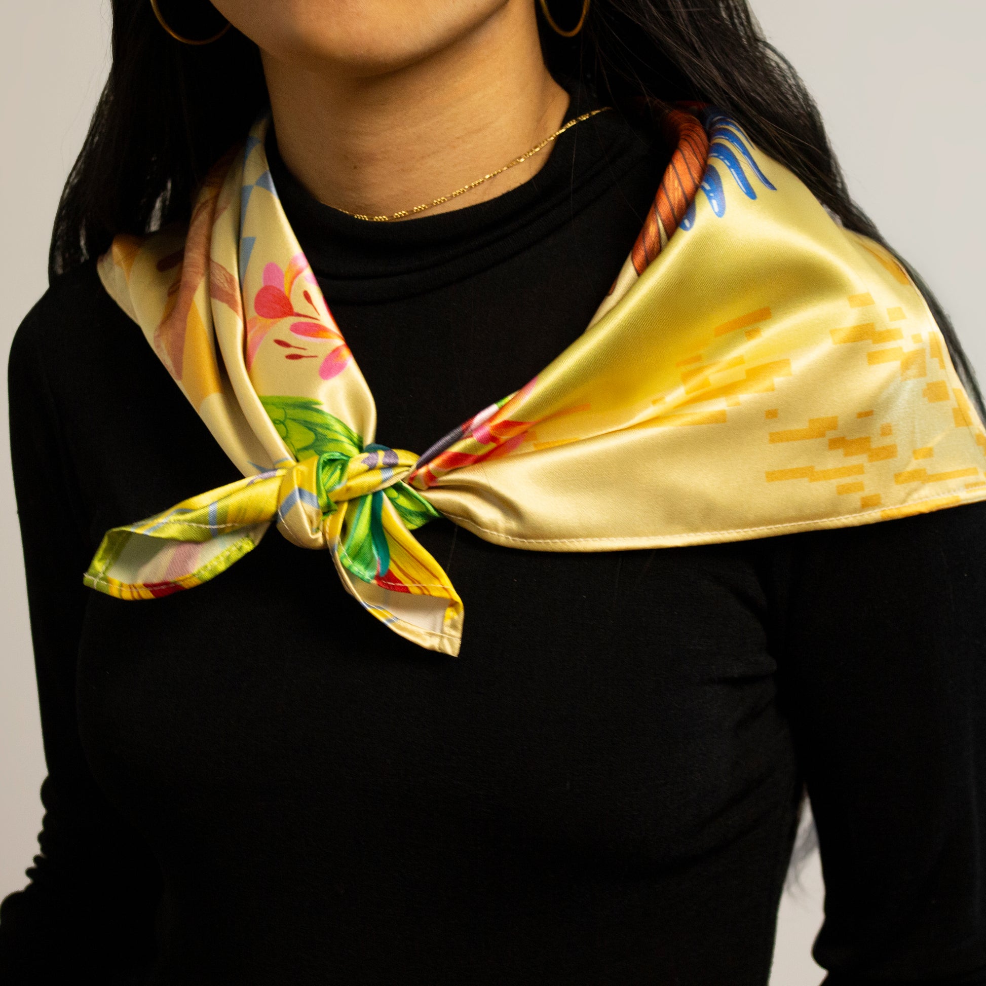 Nuestras pañoletas se pueden usar de muchas formas: en la cabeza, alrededor del cuello o incluso como un top. También son perfectas para decorar bolsos o colgarlas en la pared como pieza artística. Cada esquina tiene una ilustración diferente, para que puedas cambiar de estilo según cómo la uses o exhibas.