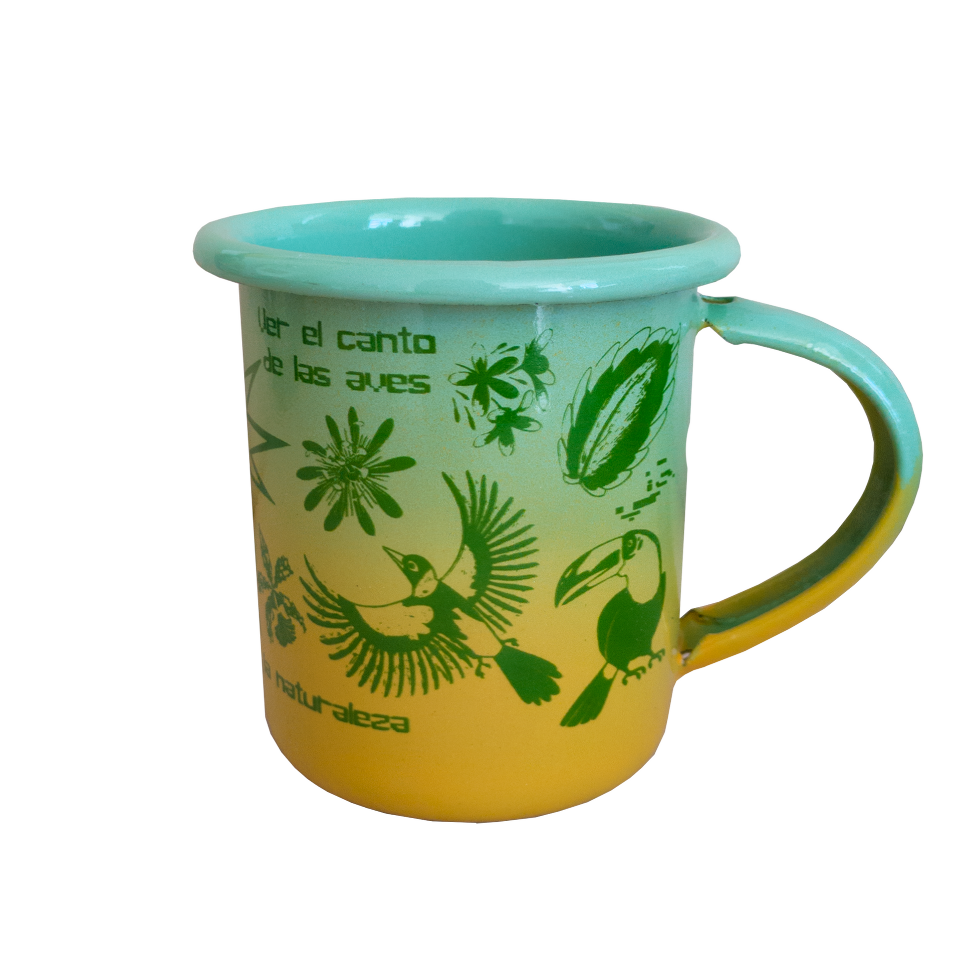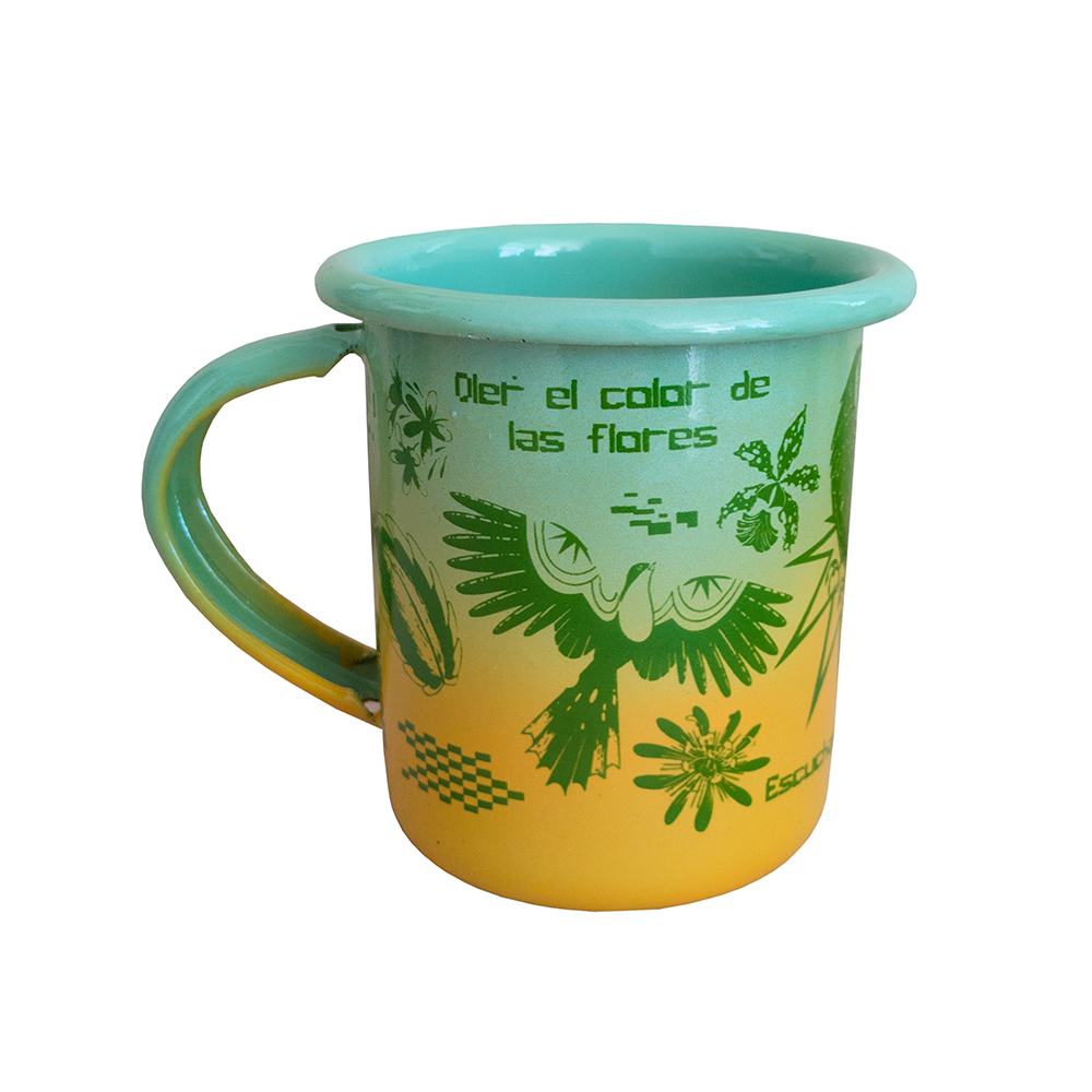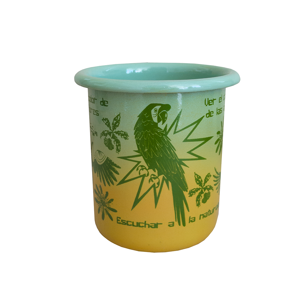 Este pocillo es en peltre con difuminado en dos colores y estampado quemado en horno.